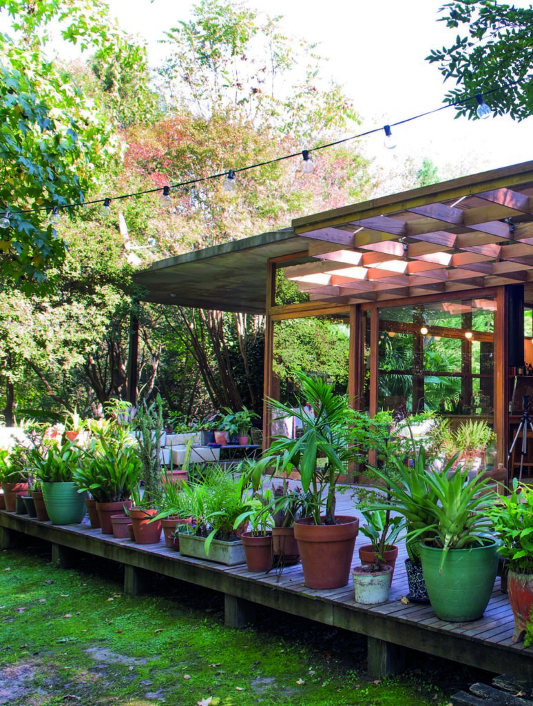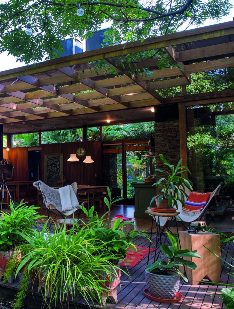 El sector de galería que recorre el área social de la casa es un deck elevado repleto de plantas. Para extender su uso en cualquier clima y momento del año, se optó por hacerle un reparo mediante una pérgola en voladizo que se sustenta desde la losa y no tiene columnas ni tirantes a la vista. El próximo paso es sumarle a este espacio una chimenea exterior pintada de un verde oliva que se mimetice con el frondoso jardín.