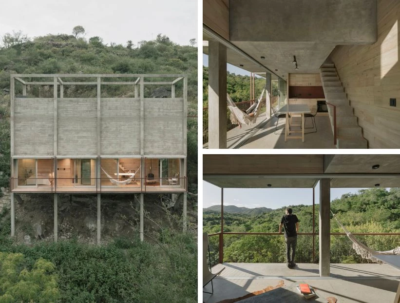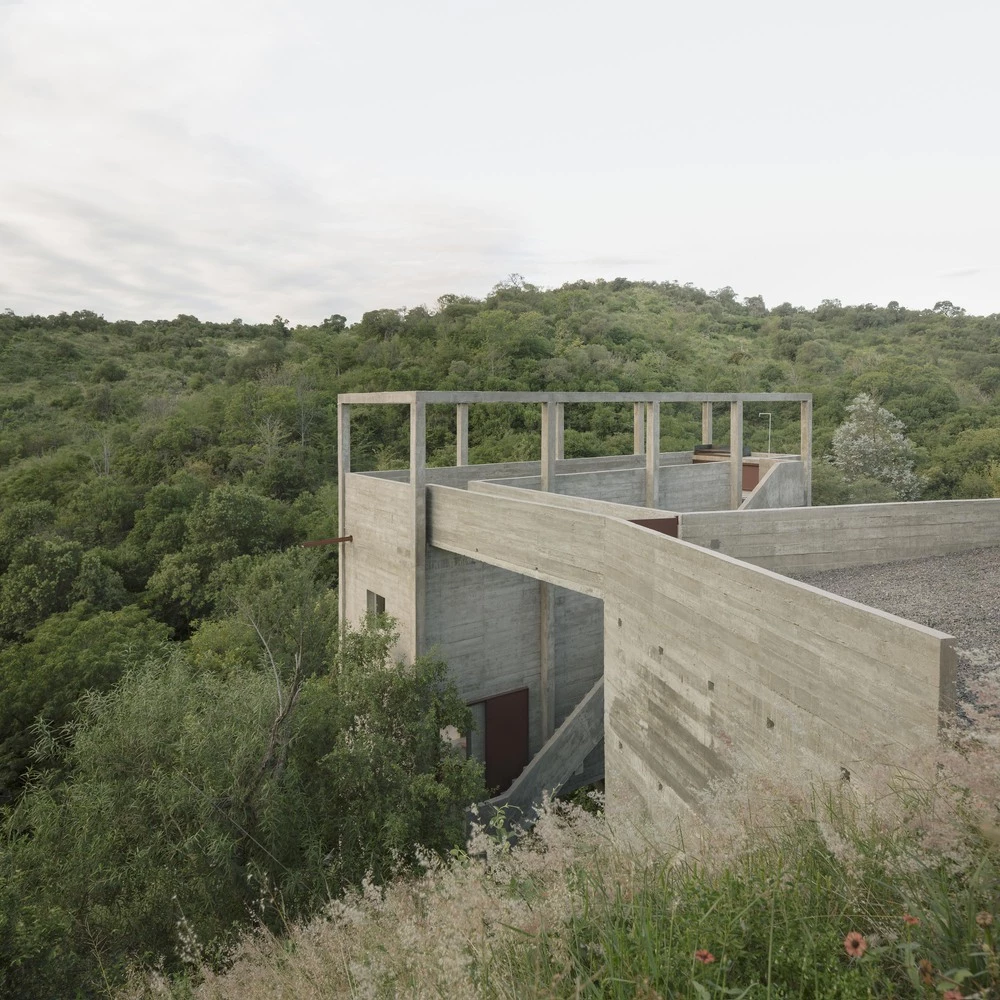 En Córdoba, en un terreno con casi 45m2 de pendiente, con el sonido del río y vistas hacia las sierras y las copas de los árboles, se desarrolla este proyecto. Una casa donde vivir, trabajar, escribir. Un entorno de soledad y tranquilidad que permite recuperar la capacidad de trabajo filosófico. En un juego de opuestos complementarios, apenas se apoya en patas.