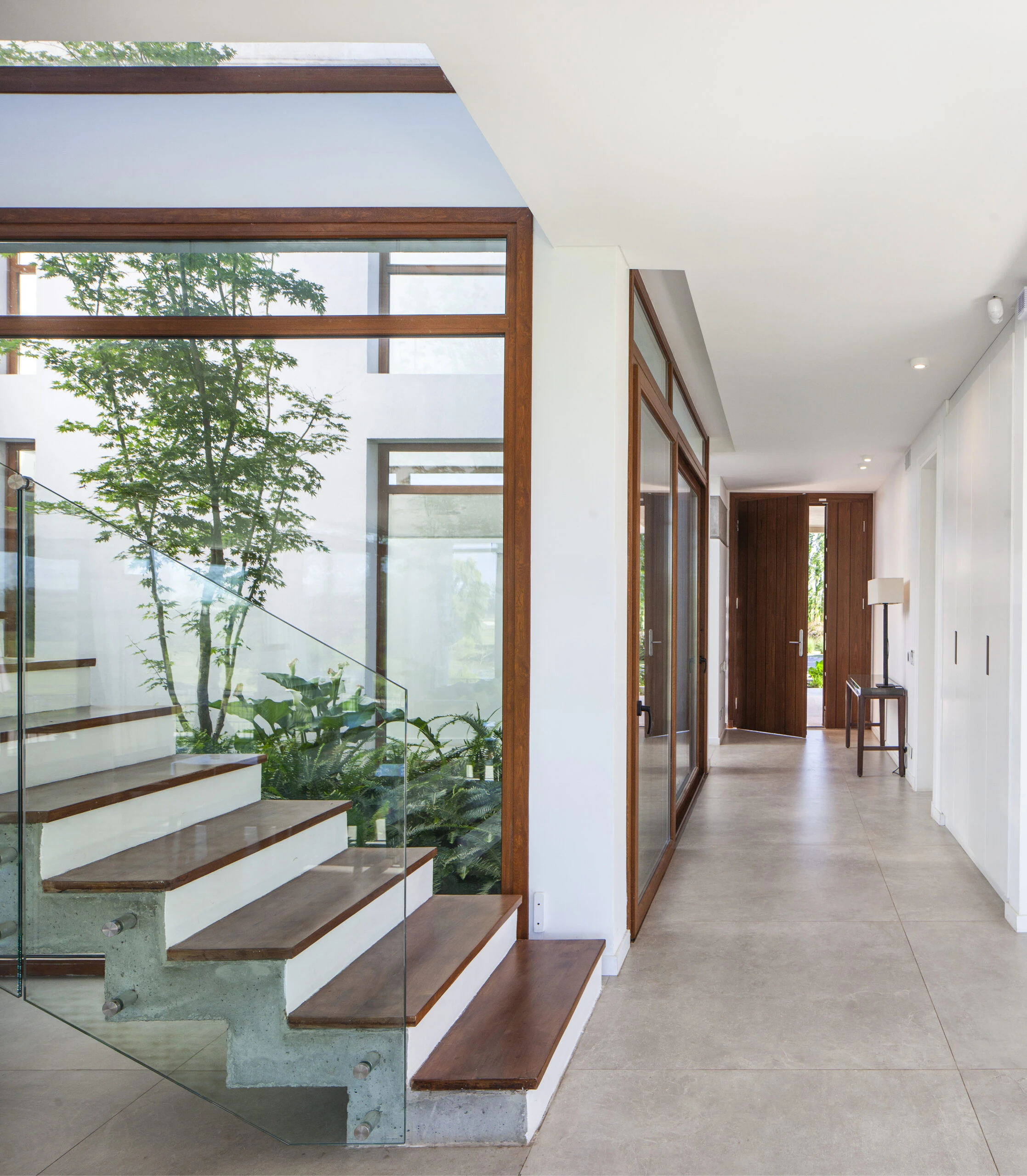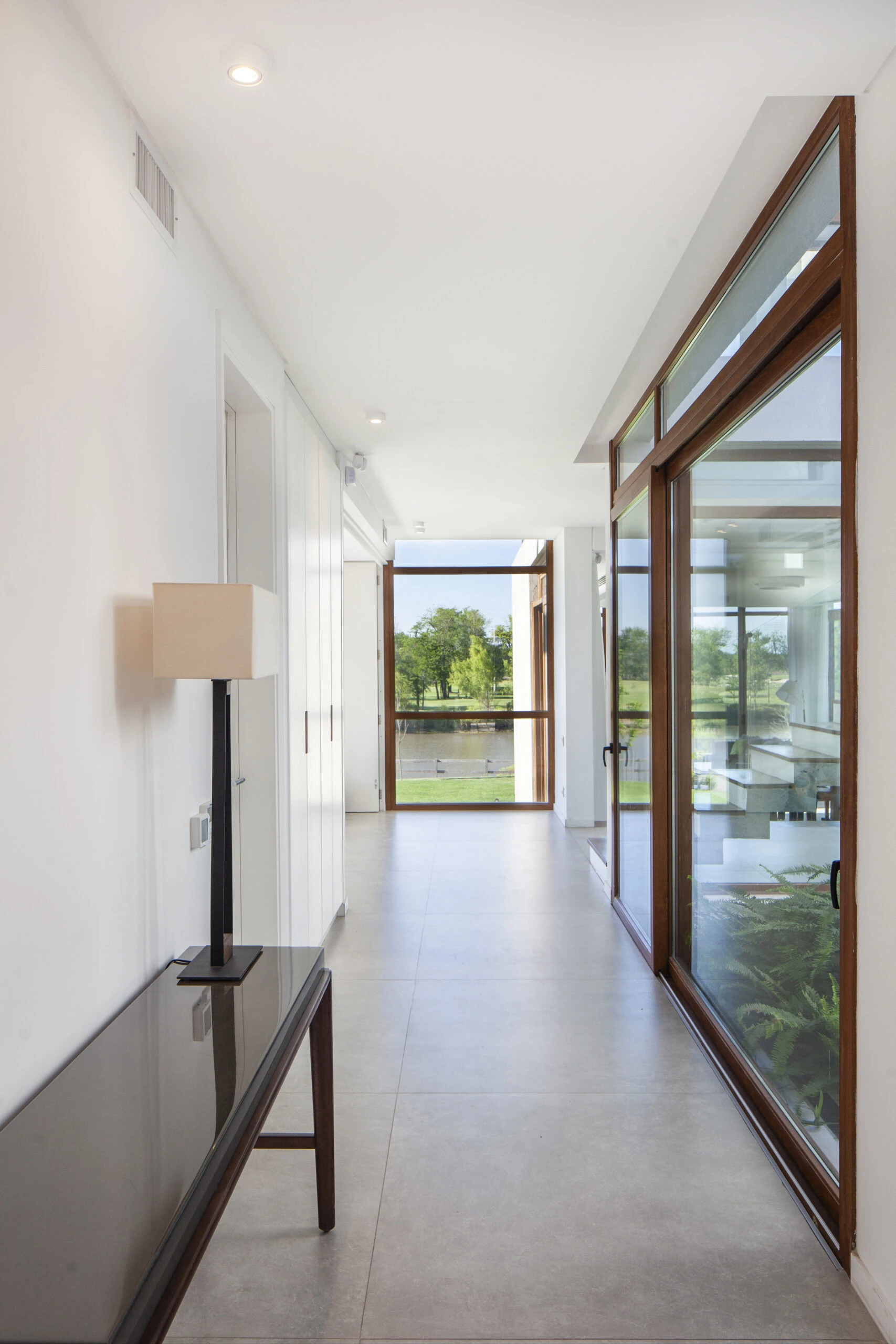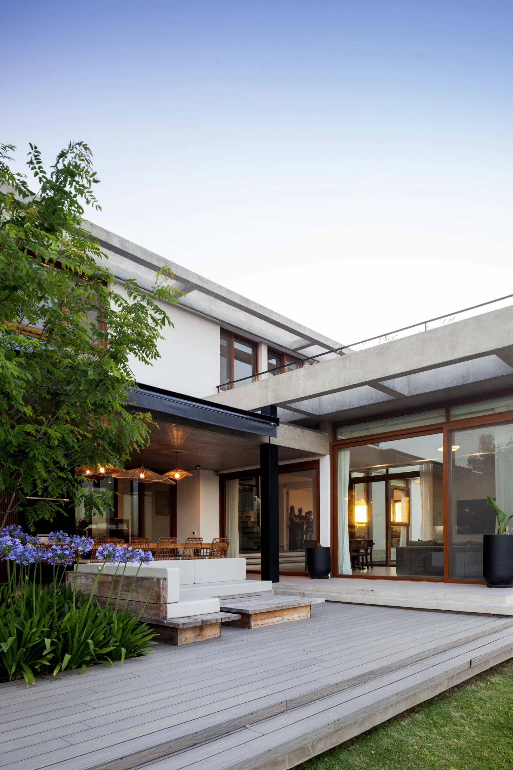 Su estructura se basa en volúmenes rotados y superpuestos en distintos niveles, generando un patio central que no solo articula los espacios internos sino que también potencia las vistas clave, como la laguna, desde el estar y la galería exterior.