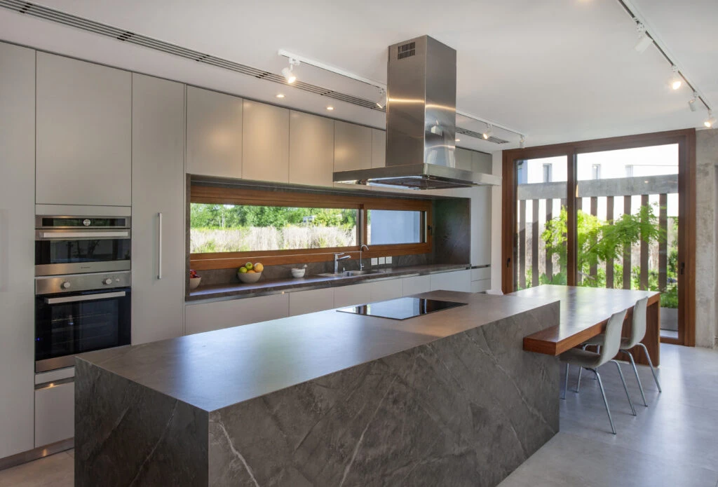 La elección de materiales sigue una línea sobria, atemporal y con mucha calidez: hormigón, travertino y madera.