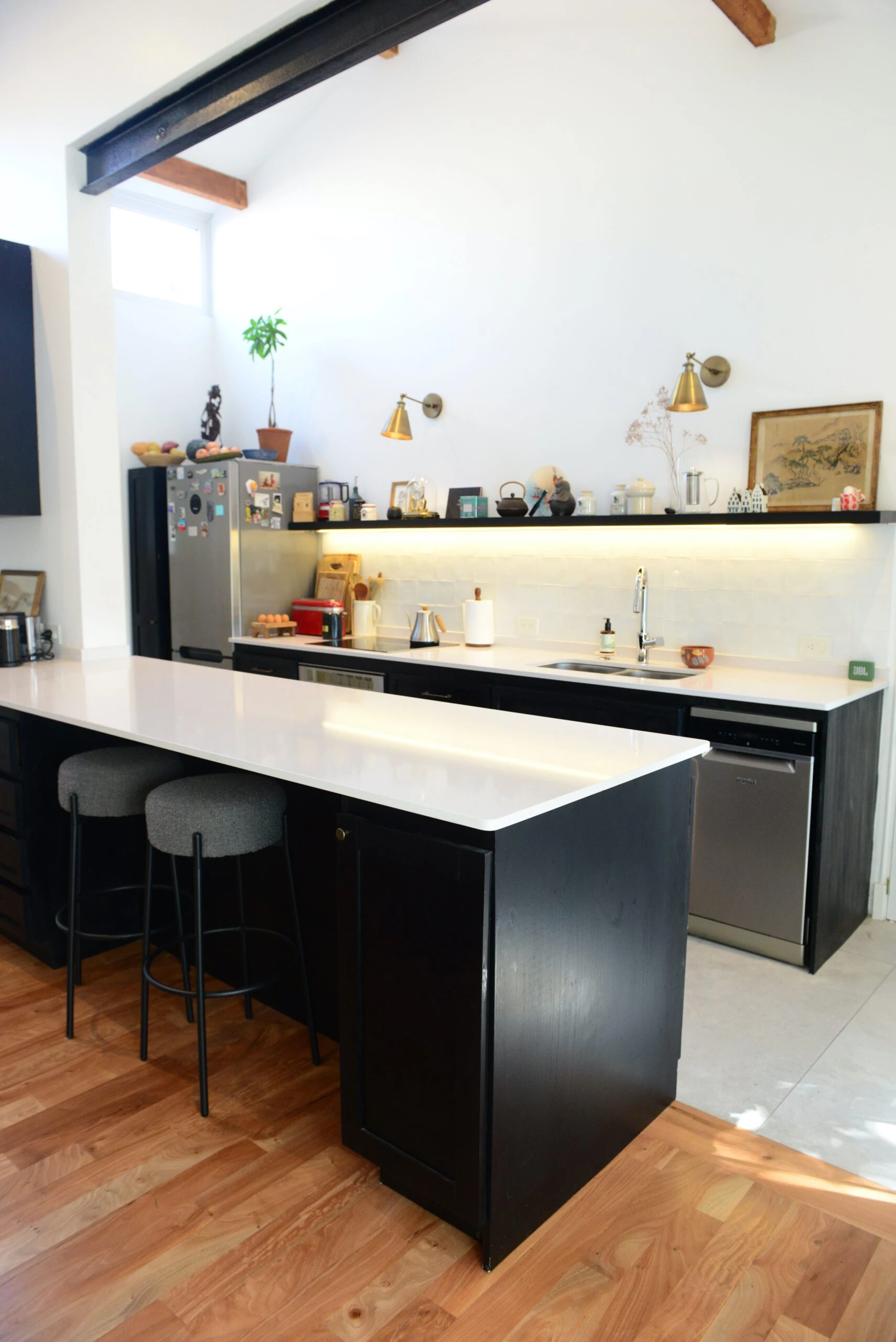 “Las mesadas son de Silestone Blanco norte, los porcelanatos son Limestone de ILVA, los muebles son todos de madera laqueados, y las banquetas de Landmark”, describe Camila, arquitecta de su propio hogar.