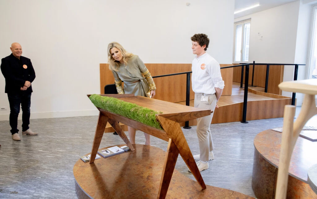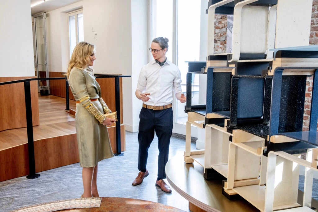 Allí, la reina de los Países Bajos charló sobre artesanía con estudiantes de HMC, una escuela de carpintería y fabricación de muebles con sedes en Róterdam y Ámsterdam.