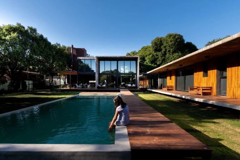 La pileta que está en relación con estos dos cuerpos, queda rodeada finalmente por el "bar" del fondo que a la vez es un contendor de barco, conformando el hito final del recorrido de la casa.