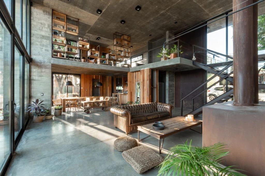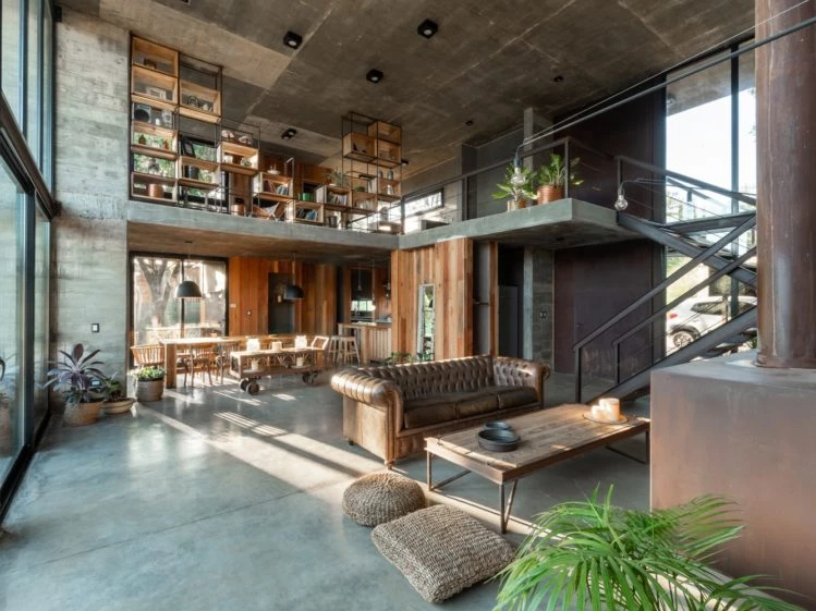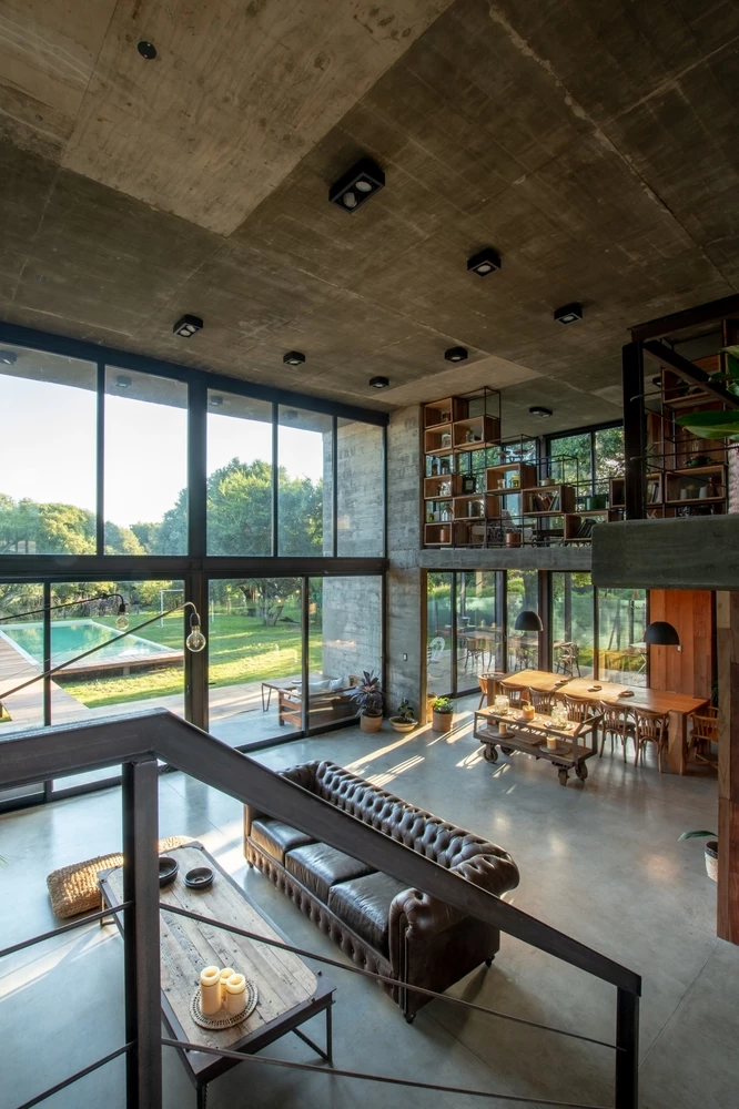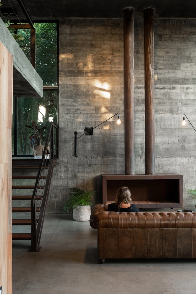 La "torre social" para estar, cocinar, invitar, comer, disfrutar, es un volumen puro de hormigón, metal y madera.