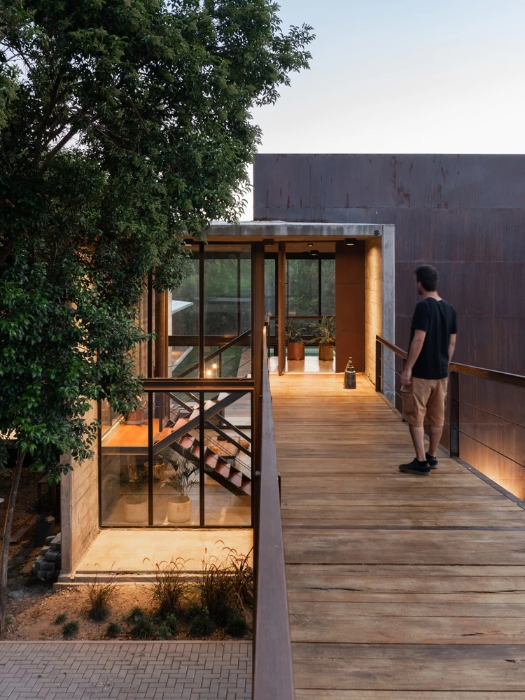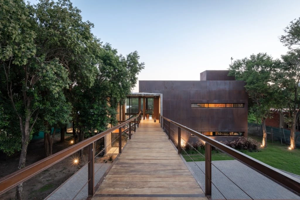 El recorrido arquitectónico empieza en el puente de ingreso a la obra, caminamos por la pasarela que se adecua a la situación de altura del terreno en su comienzo para ingresar a la casa en planta alta.