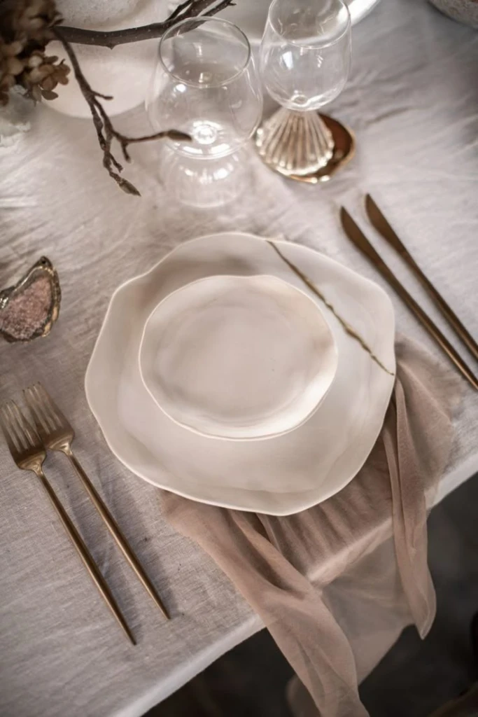 - Si querés un toque moderno, combiná la vajilla estilo artesanal con cubiertos dorados mate o vasos de cristal con textura.