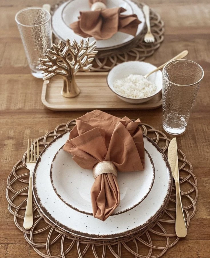 - Sumá elementos naturales como manteles de lino, servilletas de algodón y cubiertos de madera para reforzar esa estética rústica y relajada.