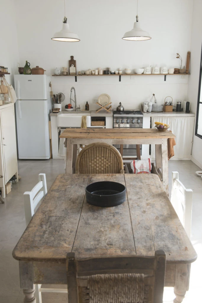 La mesa de cocina es centenaria y tiene su historia: el bisabuelo de Carolita la usaba para carnear, y pasó muchos años a la intemperie, con una chapa arriba. Su mamá la recuperó, la lijo a full y le pasó barniz para protegerla, y más adelante su hija la puso en su comedor diario integrado para seguir creando momentos con muebles con historia propia.