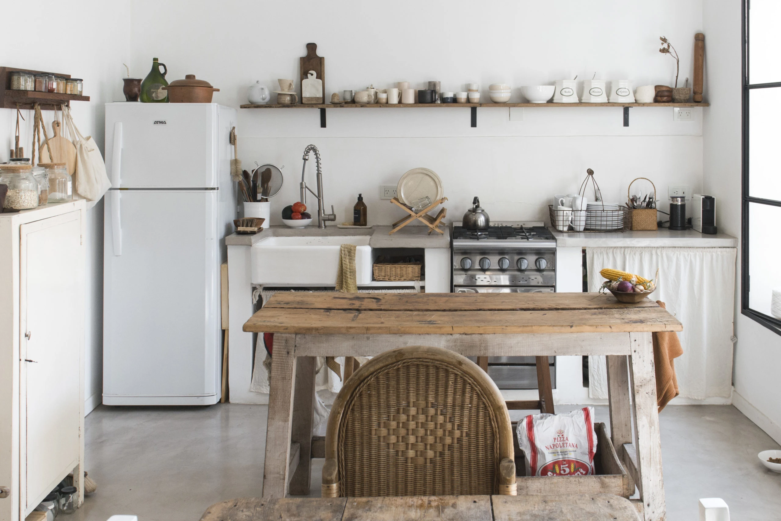 Como isla, una mesa de campo bien rústica, que muestra sin disimulos las marcas del tiempo. Tiene una altura destacada que permite guardar por lo bajo y en cajones de madera, bolsas de harina para hacer pan junto a frascos de vidrio con mermeladas caseras hechas por Carolita. La completan dos banquetas de madera.