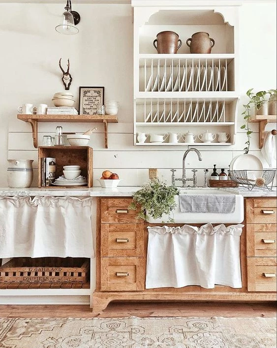 Los muebles y piezas vintage son uno de los elementos más importantes en las cocinas que llevan esta impronta. Los acabados desgastados con una pátina blanca no fallan a la hora de recrear el paso del tiempo.