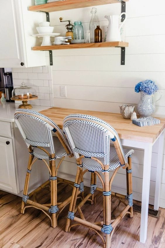 Se puede elegir una pared de la cocina que esté libre y crear una superficie de apoyo que puede ser de múltiples materiales -madera, melamina, hierro, etc., y sumar unas lindas banquetas altas.