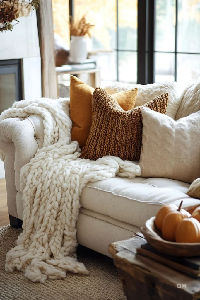 ¿Querés que el living grite invierno (pero con elegancia)? Sumá mantas de lana o tejidos chunky sobre el sillón, renová los almohadones con fundas de pana o terciopelo y, si te animás, sumá una alfombra peludita. Instantáneamente cambia la vibra del lugar. Más abrigo visual, más ganas de quedarse.