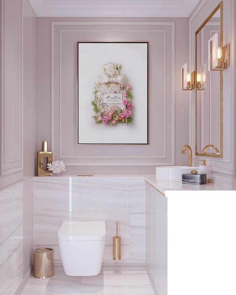 El rosa y el dorado son una dupla que siempre es sinóninmo de elegancia. En este caso, no cualquier rosa: sólo el rosa polvo o el muy pastel permiten que ésta pareja fluya . Aquí también, la opción es sumarlo en griferías, accesorios, espejos y luminarias.