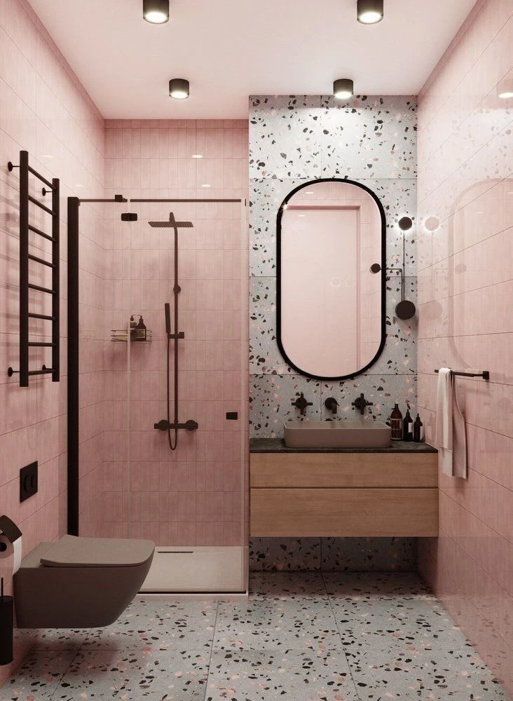 Pruebas a la vista: el negro mate le queda muy bien al rosa pálido. La mejor forma de sumarlo es optando por las griferías y accesorios (toalleros y demás) en ese acabado. Pero también lo podés incorporar en el marco del espejo, las luminarias, los toalleros radiadores o incluso la mampara.
