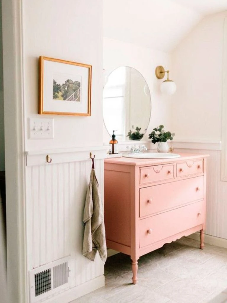 Si lo tuyo no son los azulejos, cerámicos o la pintura de paredes en total pink, buscá sumar en tu baño rosa apuntando a los detalles. En ese sentido, si tenés un mueble que oficia de vanitory o de mueble de guardado para toallas y demás, pintarlo con un rosa cálido puede ser una muy buena opción.