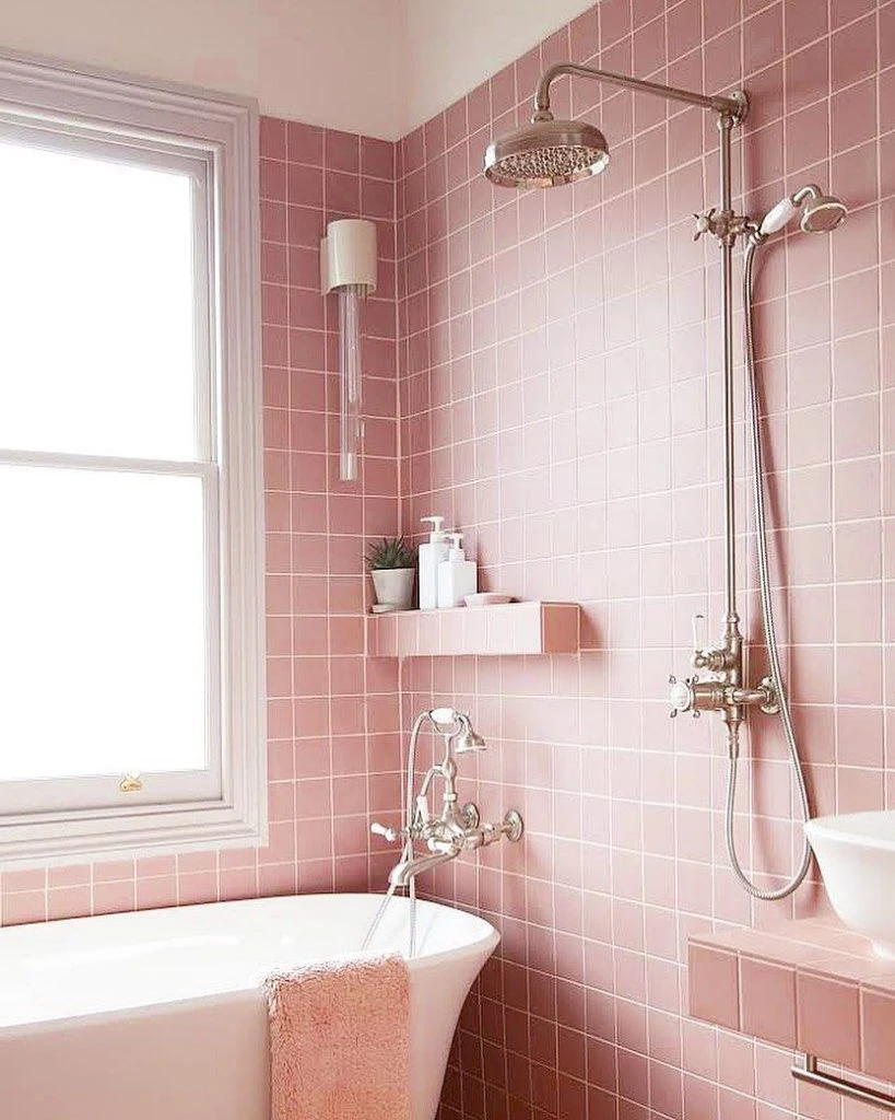 - Jugarte a pintar todo el baño de rosa o incluso revestirlo con azulejos clásicos, tipo subway o venecitas en un infinito de rosa.