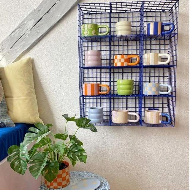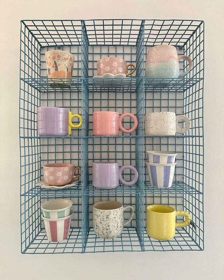Armá una grilla con listones de madera o metal, tipo tablero organizador, y colgá las tazas. Es ideal para cocinas chicas, porque casi no ocupa espacio y suma mucho estilo.