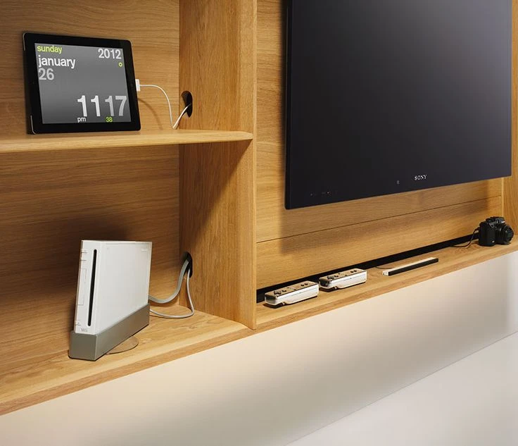 Los racks o muebles a medida con fondo cerrado permiten pasar todos los cables por detrás sin que se vean. Algunos modelos incluso vienen con pasacables incorporados. Es una buena opción si querés mantener todo ordenado sin complicarte.