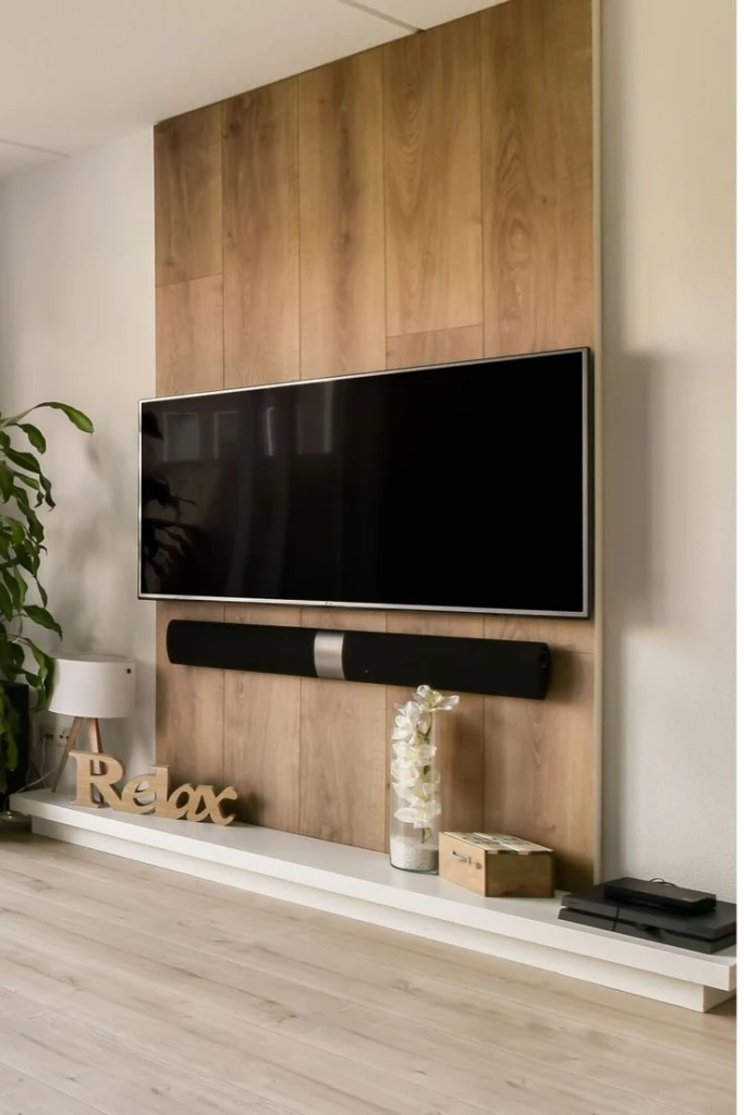 Una idea con mucha onda: colocá un panel de madera detrás de la tele y escondé los cables por detrás. Puede ser de machimbre, listones verticales o una placa lisa. No solo oculta los cables, también suma calidez y diseño. Si le agregás tiras led, el resultado es de revista deco.