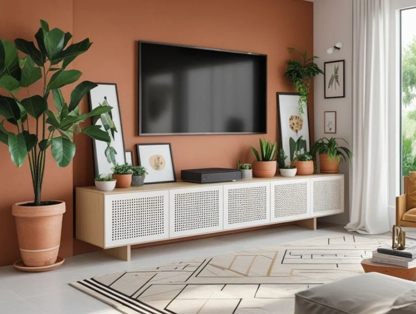 Una idea con mucha onda: colocá un panel de madera detrás de la tele y escondé los cables por detrás. Puede ser de machimbre, listones verticales o una placa lisa. No solo oculta los cables, también suma calidez y diseño. Si le agregás tiras led, el resultado es de revista deco.