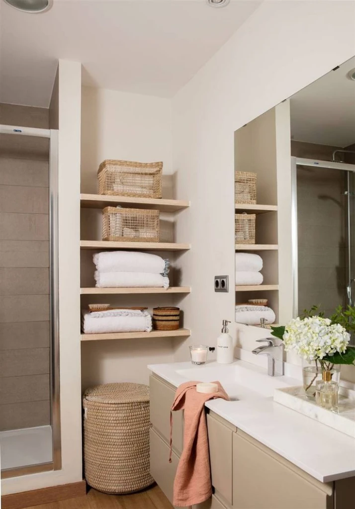 Si tu baño tiene una esquina o espacio específico desaprovechado, sumá un pequeño mueble esquinero o una torre vertical de almacenamiento a medida. No ocupan mucho espacio y te permiten organizar un montón de cosas sin desorden.