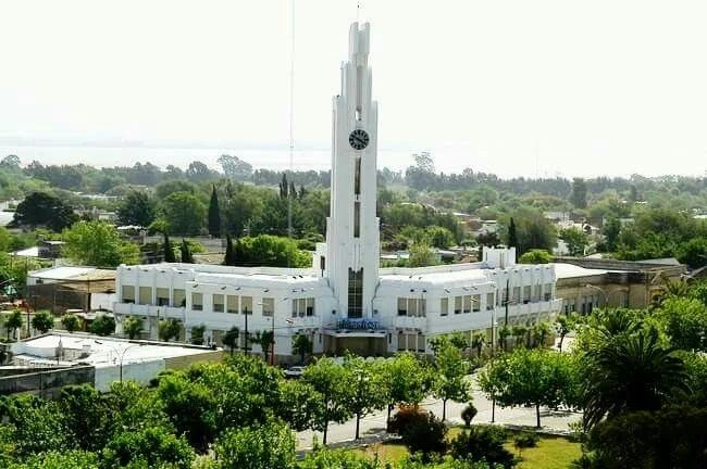 La municipalidad de Villa Epecuén es monumento histórico nacional: mide 40 metros, combina mampostería revocada con hormigón y reserva para el basamento un zócalo de mármol travertino. Sus complejas combinaciones de curvas y rectas se acentúan en la torre del reloj dejando ver una estructura perfectamente detallada y singular.