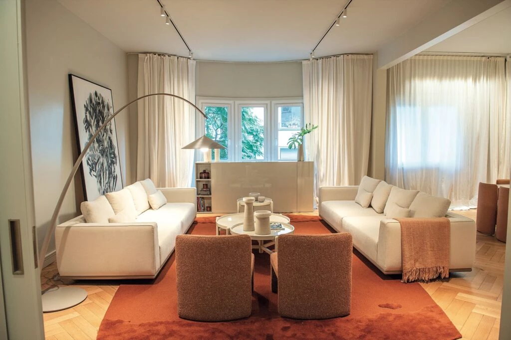 El living de este depto con estética moderna y minimalista propone muebles en formato grande y una paleta de terracota y visión. Acomoda dos sillones de cuatro cuerpos enfrentados (Hábito), con un set de mesas bajas de madera laqueada en distintos tamaños (Hábito) al centro. De espadas, un juego de poltronas íntegramente tapizadas en género (Ascolta) que engaman con el color terracota intenso de la alfombra (Kalpakian) logrando una continuidad cromática.