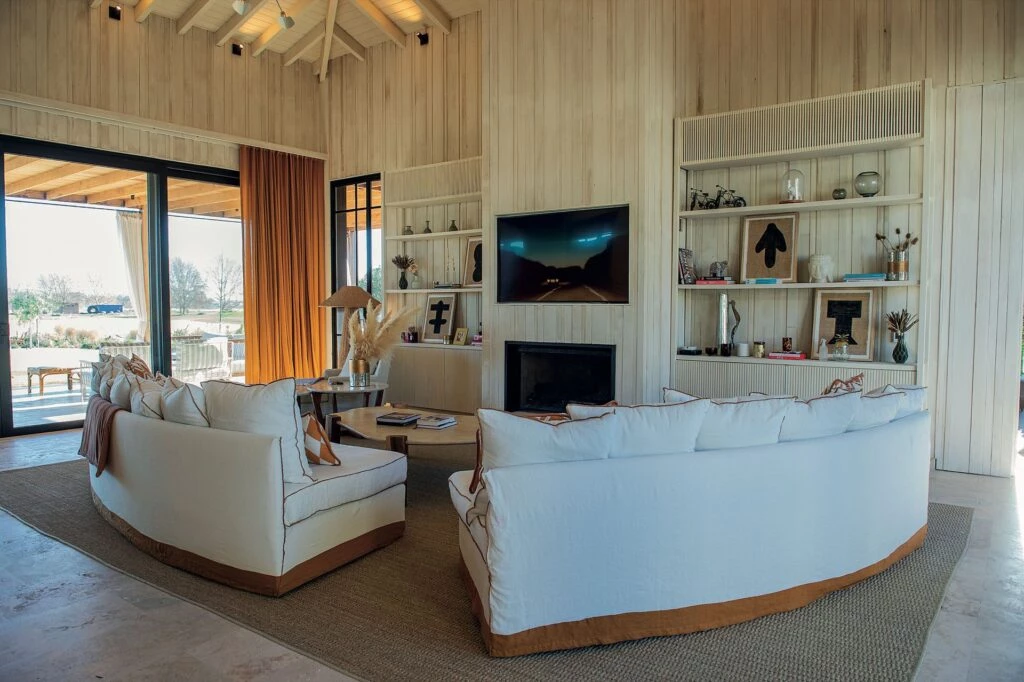 El living de esta casa original se plantea como una gran caja de madera, con tirantes de distintos anchos que revisten las paredes y el techo a cuatro aguas, además de darle forma los estantes de las bibliotecas ubicadas a cada lado de la chimenea. Hacia ella miran los dos sillones semi curvos tapizados en lino (@sentido_joseignacio) que se arriman a una mesa baja en cuero y madera. Las ventanas llevan cortinas en color maíz (confección de @soon.deco con géneros de Casa Almacén). Alfombra (Sentido). Cuadros en negro y beige (@p.marinmoreno_art) y velas (Voluspa y Rapsodia).