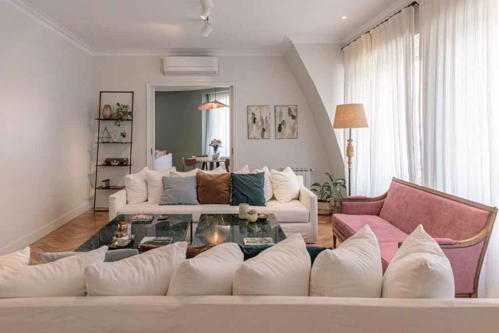 El living de este depto cálido y colorido resume cierto estilo clásico y francés. Un sillón de pana rosa marca el tono del espacio, acompañado por dos sofás blancos en tussor off white y con almohadones de lino y tussor (delevie_telas) que suman un aire mas fresco y actual. Al centro, en línea, dos mesas simétricas con base de hierro oro viejo y mármol verde Remigiato.