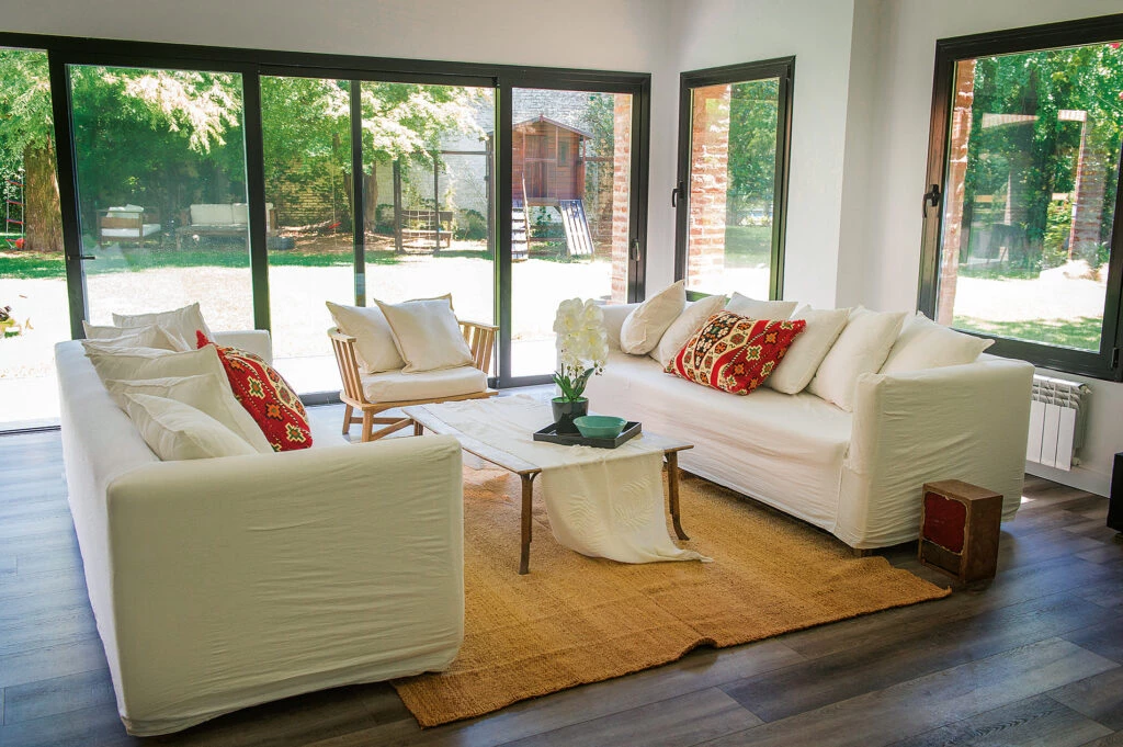 En el living de este clásico chalet renovado resuelto con pocos elementos con una misma estética, las vistas abiertas al jardín lo invaden. Dos sofás con fundas de tussor blancas (@mareco) y almohadones tejidos en un color vibrante (@gloriaatelier) se enfrentan sobre una alfombra de la colección Wool (@thecarpetco).