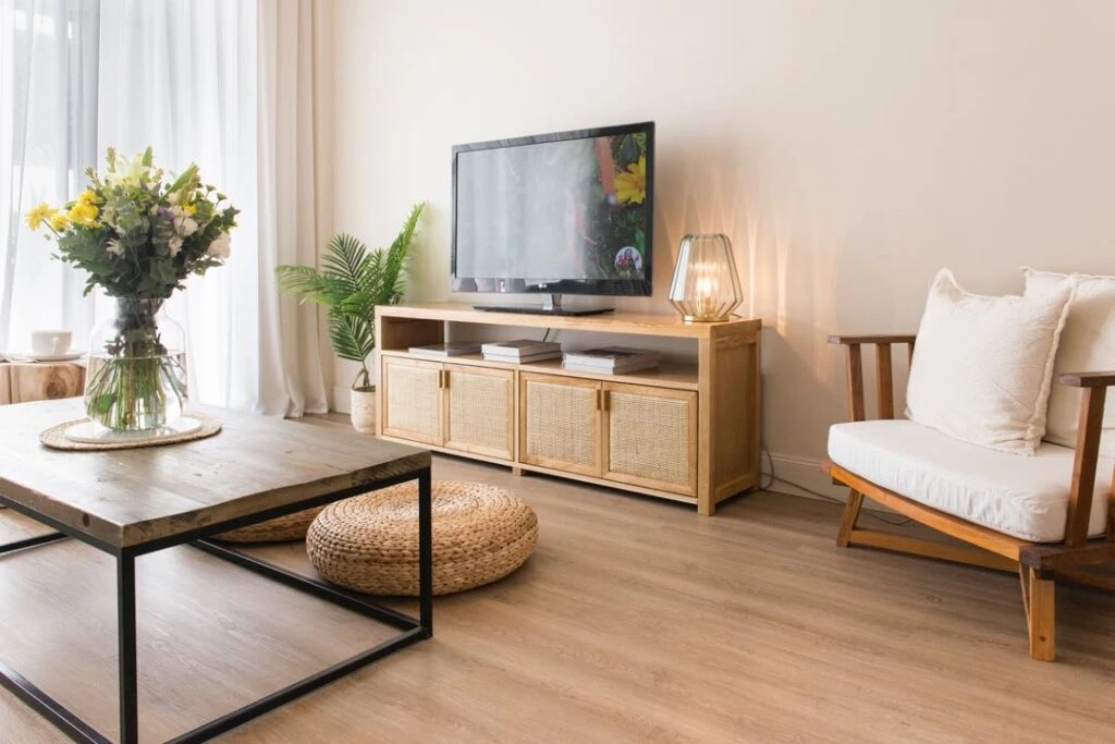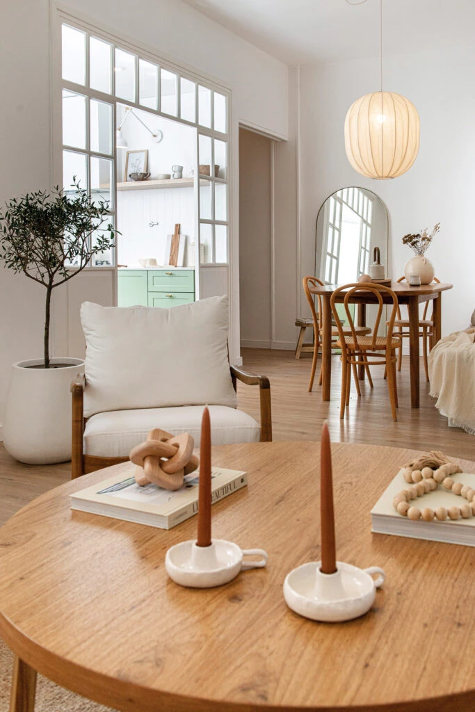 Este living es parte de un departamento cálido y relajado con alma campestre. Es descontracturado, calmo y funcional, y capaz de ajustarse al estilo hygge, la filosofía danesa del buen vivir. En esa línea se eligió equiparlo con una mesa baja de petiribí (@woodmarketfurniture) decorada con candelabros con velas (@apatheia), nudo de madera (@kaika.home) y tira de cuentas sobre libro (@food.and.stories), y un sofá esquinero (@innovationhome) con funda y pillow en tussor (@milliemuller.homedeco) y manta tejida artesanal (@tiendadecostumbres).
