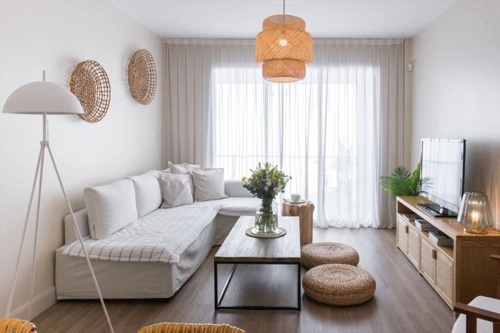 El living del departamento de Agustina Bonforte propone blancos y calmos, dónde solo el color de la madera y las fibras, marcan contraste. Cuenta con nuevos pisos vinílicos de PVC símil madera (modelo Aqua Logic), sofá en “L” vestido de punta en blanco (Ikea) que abraza a la mesa baja de madera reciclada (de la firma inglesa Loaf), pufs y lámpara de fibras naturales (@food.and.stories).