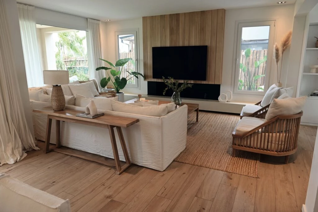 El living de esta casa diseñada por Roxana Lotersztain (@rl.interiordesign) propone blanco, maderas claras y fibras.