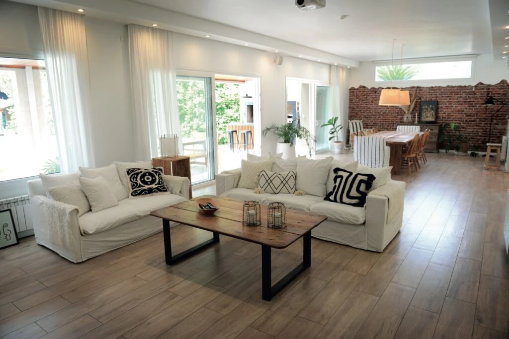 Blanco, madera y ladrillo visto para el living fresco con notas de verano, de esta casa pensada para el relax y el bienestar.