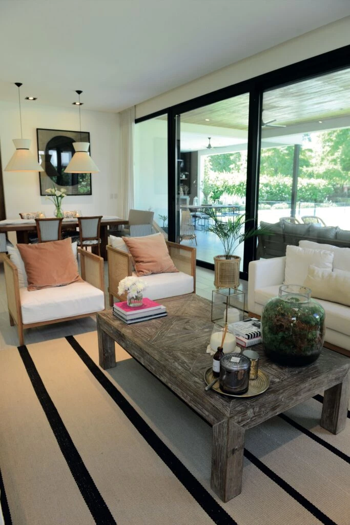 Los espacios amplios y despojados son claves en esta casa de diseño moderno y decoración contemporánea, como prueba, basta echarle un vistazo al living, donde se acomodan dos sofás con fundas de bull blanco y una mesa baja de petiribí (@manzohome) sobre una alfombra gruesa de lana natural con rayas sutiles en negro (@finiahome).