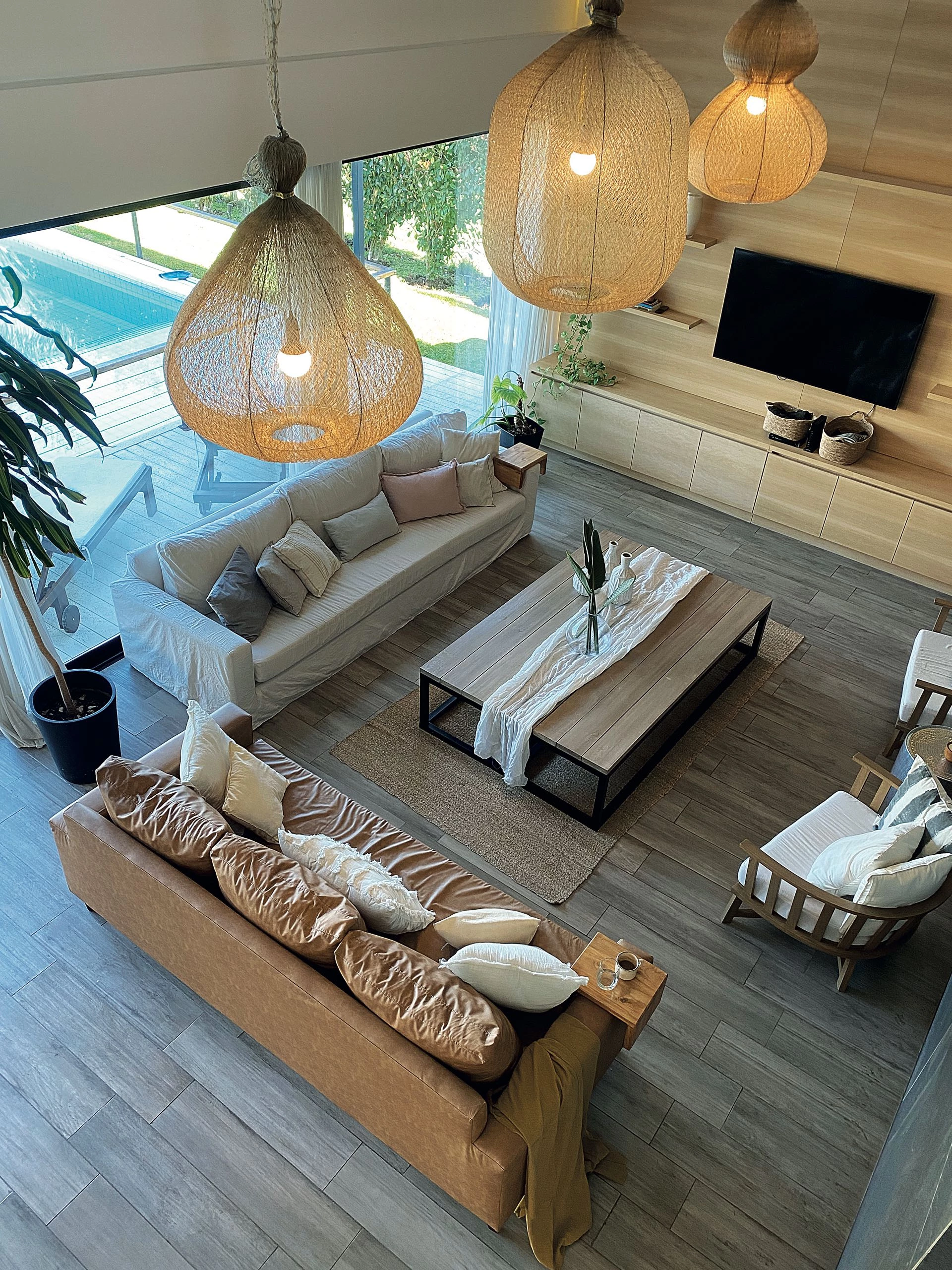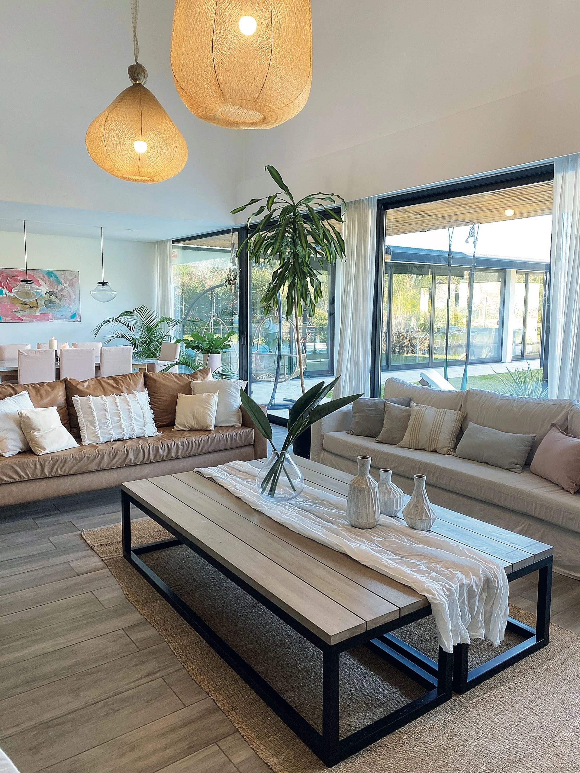 Al centro se ubica una mesa de hierro y listones de madera de petiribí, con un camino de gasa, jarrones blancos y florero (@masu.home2021). Tres lámparas tejidas (@companianativa) acentúan la doble altura del espacio. Los pisos de porcellanatos símil madera suman un toque de calidez.