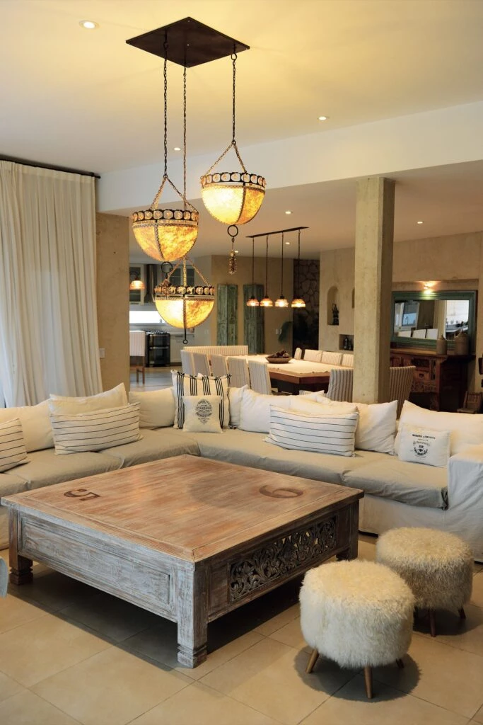 El amplio living de esta "casa jardín" diseñada para el encuentro enamora con su simpleza y toques bohemios. Se sumó un sillón en “L”, dos pufs con piel y una mesa de Indonesia. Mención aparte para la escenográfica lámpara que sobrevuela el espacio.