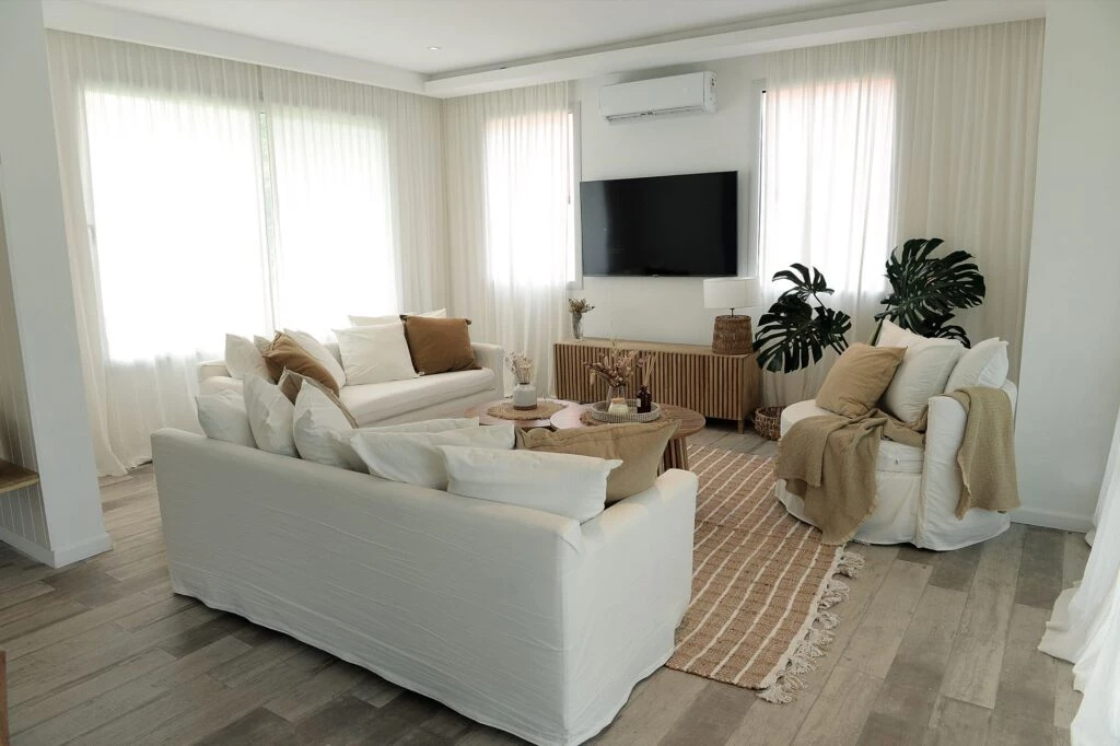 El living de esta casa en la ciudad decorada con aires de playa propone dos sillones de 8 x 2 m modelo Ghost con funda en tussor (@goraldeco) y almohadones off-white y en tonos marrones (@aukeniahome y @conpasiondeco) se acomodan de cara a la tevé ubicada entre dos ventanales, junto a un mueble bajo con frente envarillado en alamo teñido con tinte petiribí (@aukeniahome).