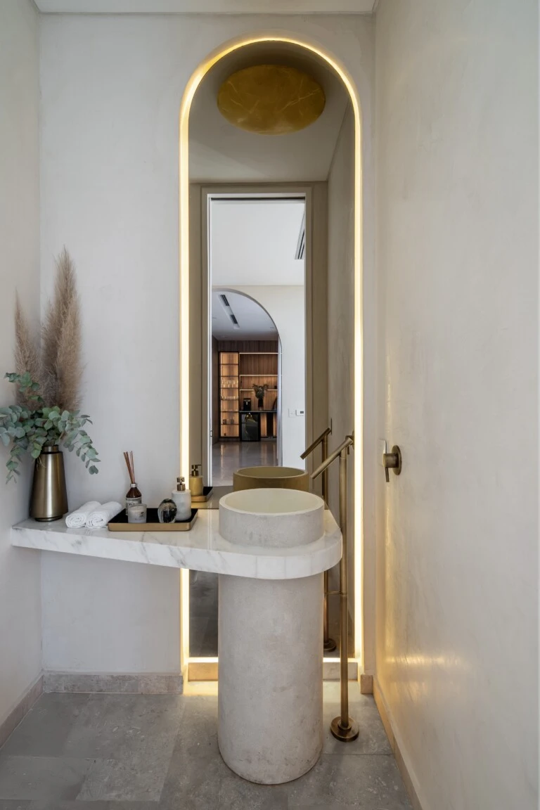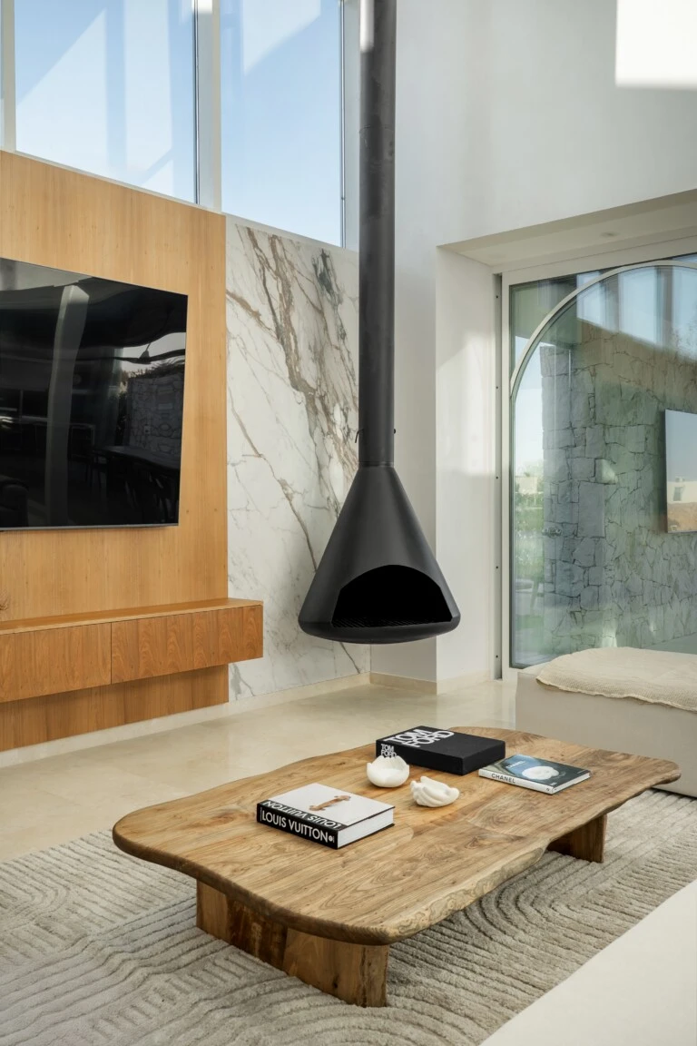 Se priorizaron materiales nobles, honestos y con fuerte presencia sensorial: piedra natural, maderas macizas, mármoles y revestimientos en tonos tierra que conectan con el entorno.