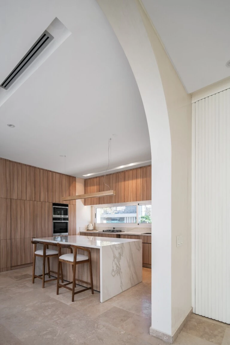 El mobiliario a medida y los elementos de interiorismo refuerzan el lenguaje arquitectónico, generando un interior sereno, cálido y elegante.