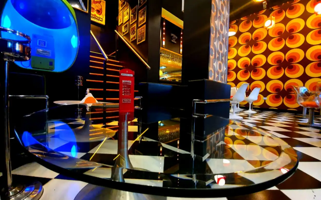Empapelado con el típico diseño postmoderno y futurista de los comedores de la clase media de los años 70 y 80 y hasta la música, que puede ir desde Rick Astley hasta Carlos Mata, recrean la atmósfera de aquel tiempo que se fue.
