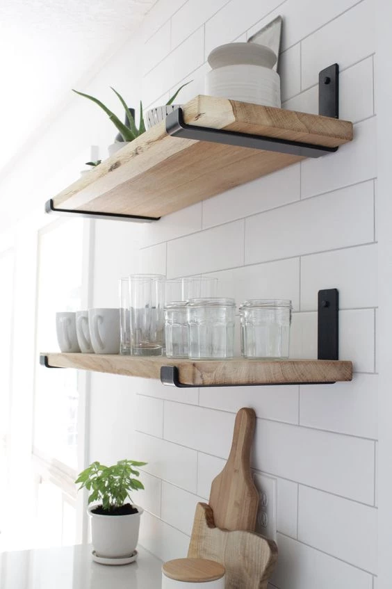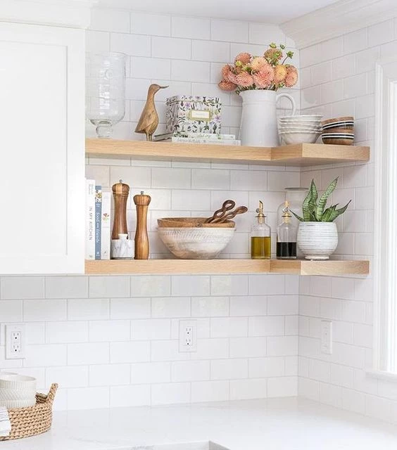 - En cocinas grandes, los estantes flotantes permiten acomodar y lucir diferentes objetos preciados como tazas, jarras, vasos, especieros, tablas o incluso se suelen colocar elementos decorativos como macetas con flores frescas, libros de recetas y cuadros.
