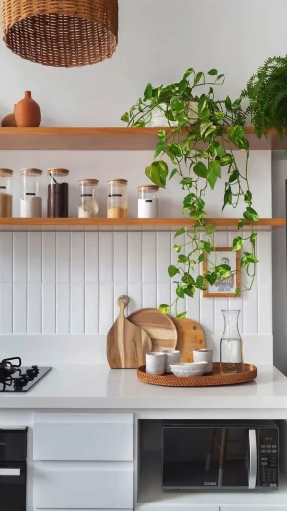 Sobre las alacenas, despensas u otros muebles altos de la cocina, en estanterías, escaleras o incluso con un gancho desde el techo o con un barral sobre una ventana, las plantas colgantes son perfectas para imprimirle un toque verde a tu cocina.