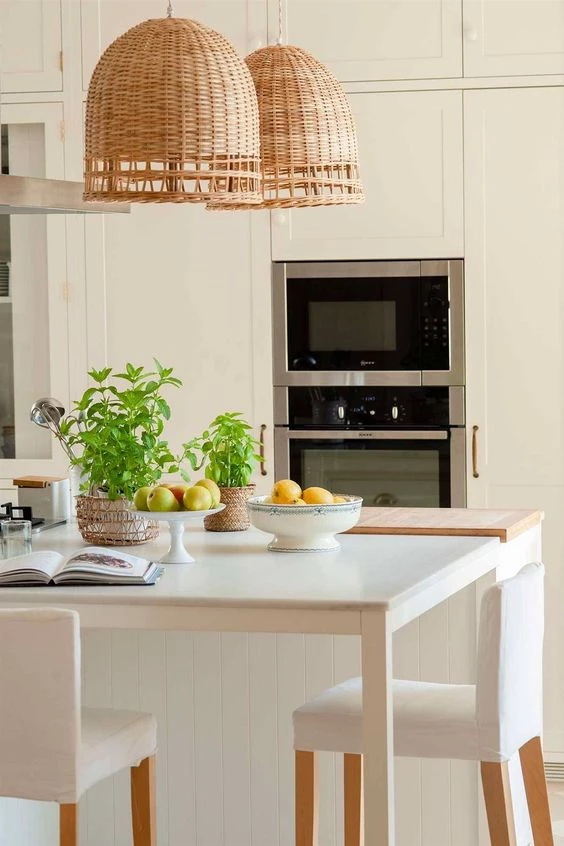Y uno de los tips para conseguir un ambiente acogedor, es enmarcar la zona donde se come iluminando la cocina con una lámpara colgante baja y cálida.