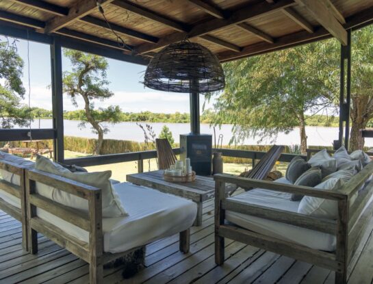La galería continúa con la misma estética que el interior de la casa, con impronta boho chic y natural coronada por el techo tipo pérgola de eucaliptos.