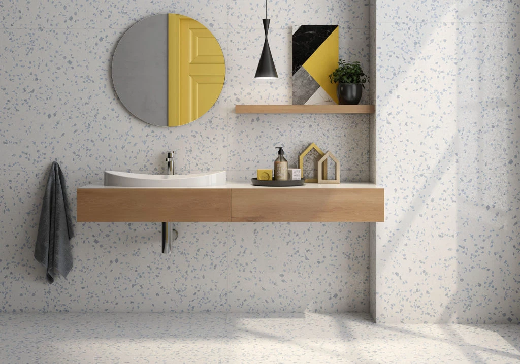 - Porcellanatos o calcáreos símil terrazo: son placas estándar pero con las ventajas de sus revestimientos de base (porcelanatos o calcáreos, según el caso) y la apariencia del terrazo.