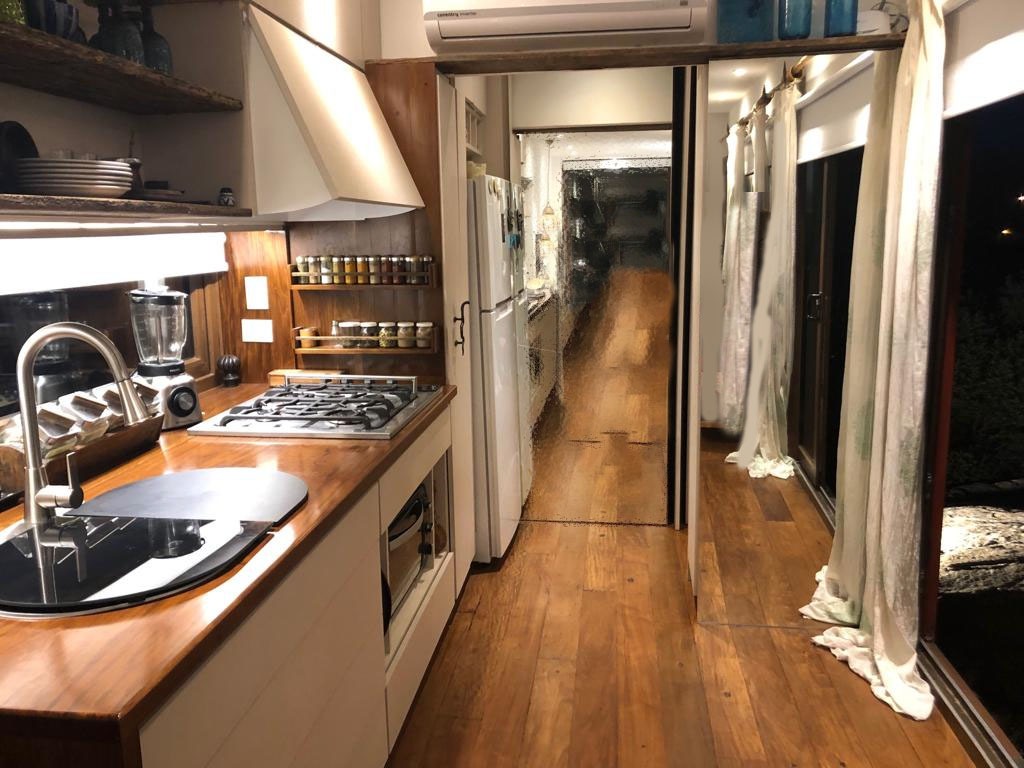 Detalles de confort incluyen electrodomésticos inverter, calefactor solar, biodigestor, un tubo que lleva los desechos orgánicos directo al compost, una infaltable la Salamandra a leña y un estanque que recoge el agua de lluvia.