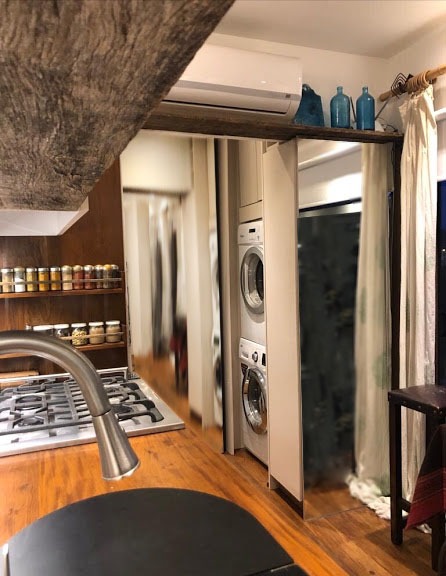 Cajones con divisores, módulos extraíbles, especias rotuladas y en su sitio, etc., componen este espacio que también alberga una lavadora y una secadora que se oculta con paneles deslizantes y frente vidriado.