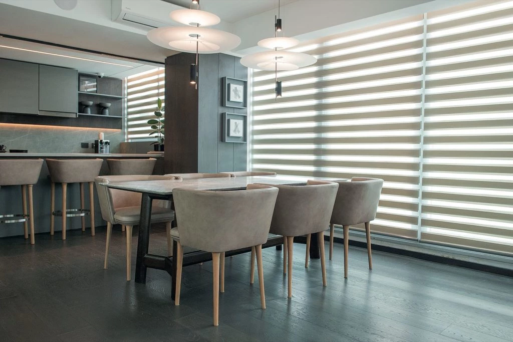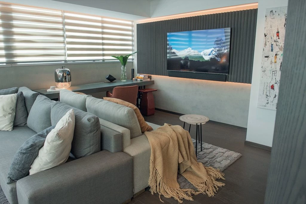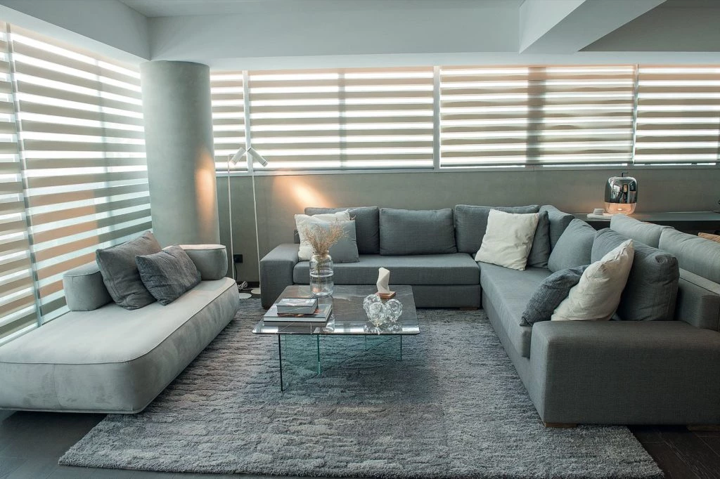 Empezamos el corrido por el luminoso living con sus ventanales en esquina que se cierran con unas cortinas estilo Eclipse (Hunter Douglas).