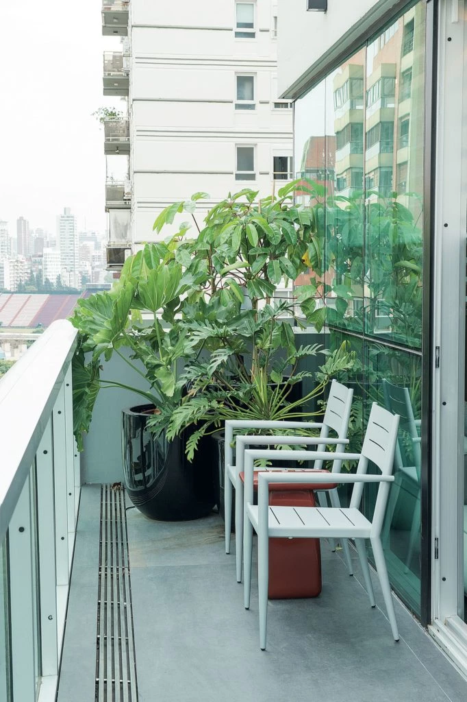 El balcón tiene paisajismo de Ariel Oliva y acomoda dos silloncitos con cuerpo de metal (Coin Vert) y una mesa Scott (Matriz Design).